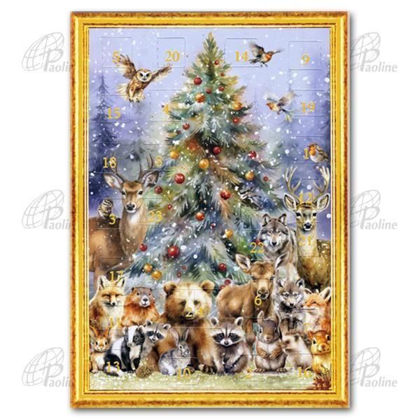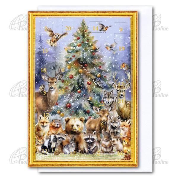 クリスマスツリーとたくさんの動物たちが描かれた、アドベントカードです。
